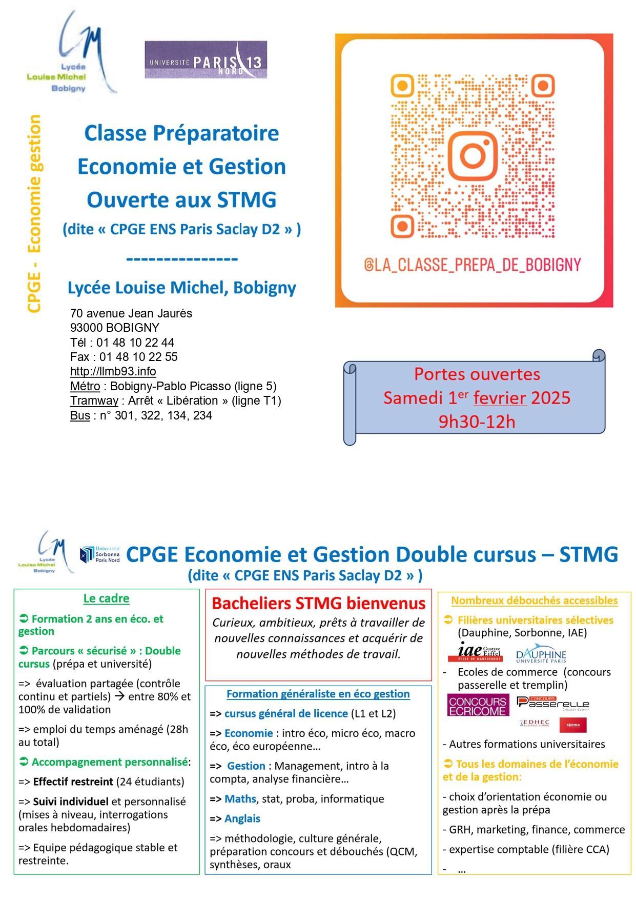 La CPGE Économie et Gestion du lycée Louise Michel à Bobigny vous invite à ses portes ouvertes le samedi 7 février 2026, de 9h30 à 12h. Ci-dessous un diaporama présentant cette formation.
